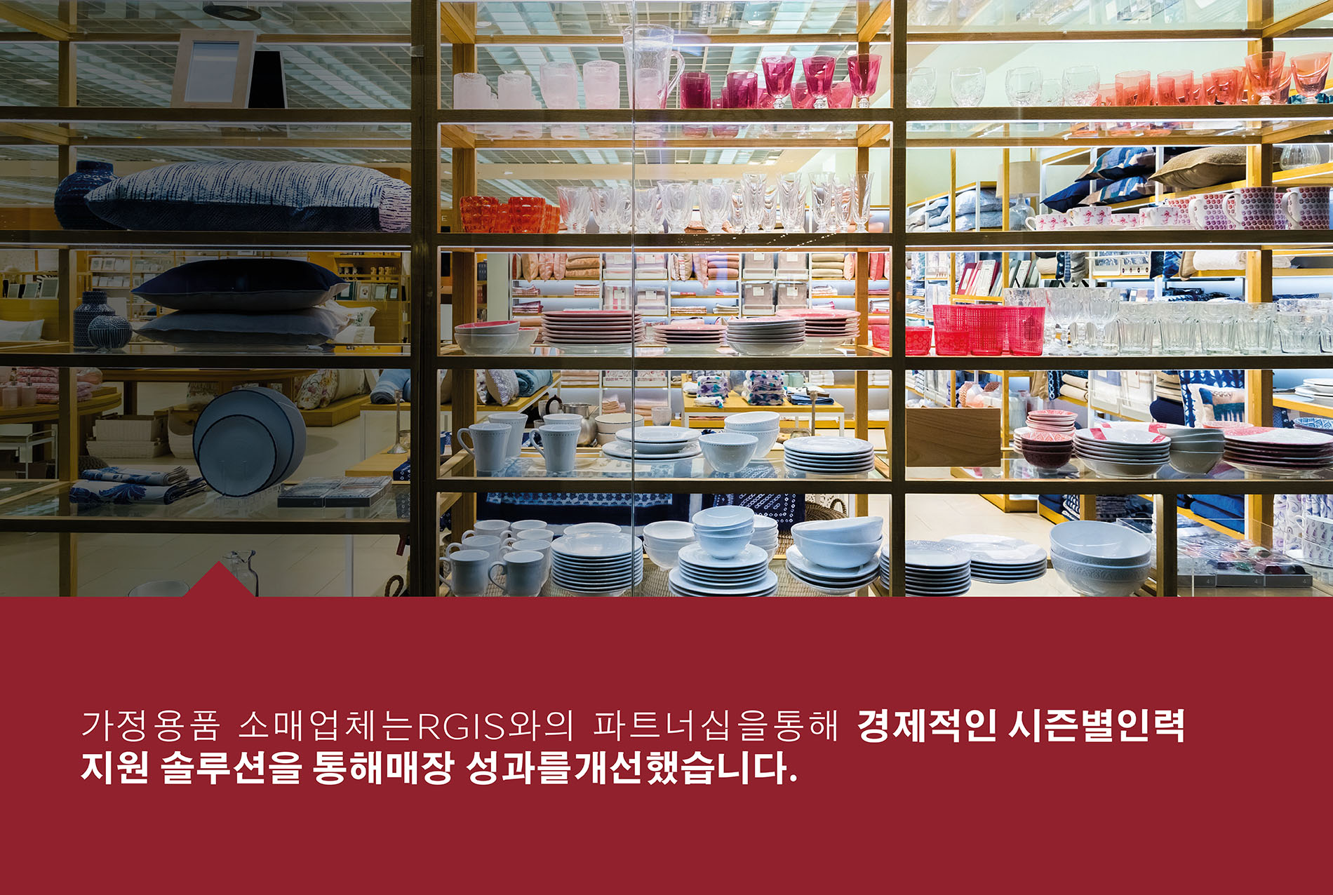 가정용품 소매업체는 시즌별 수요 업무를 소화하기 위한 인력 부족으로 인해, 시즌별인력 지원이 필요했습니다. 가정용품 소매업체는 RGIS에 다음 사항을 요구했습니다: